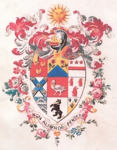 Arms of Coke, of Trusley: Gules, three crescents, and a canton or.